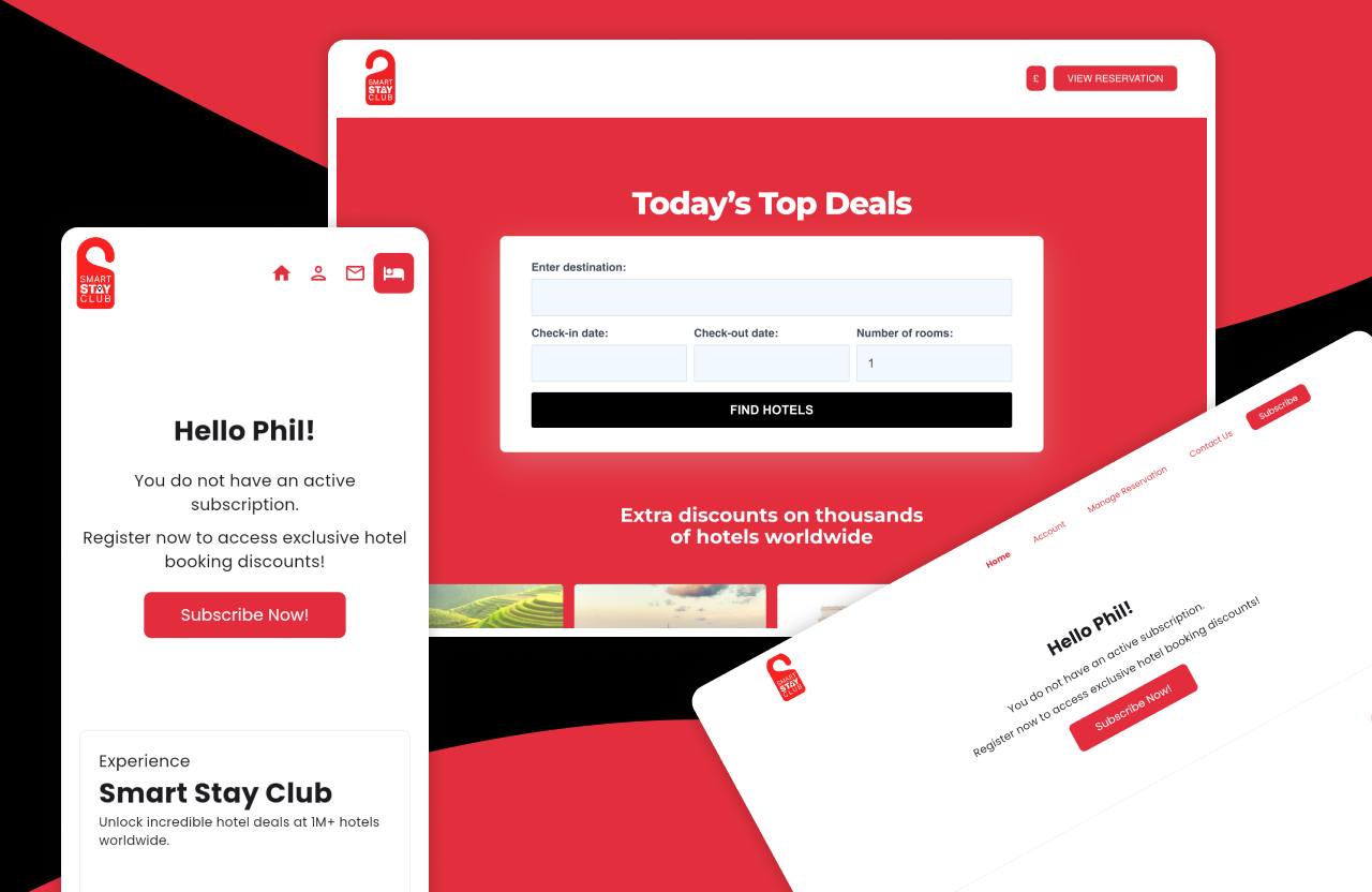 We designed the full user experience - signup flows, subscription management, hotel search and booking, and the partner-branded portal - and walked through an interactive prototype with the client. Changes were cheap at this stage, so we refined until we had it right.